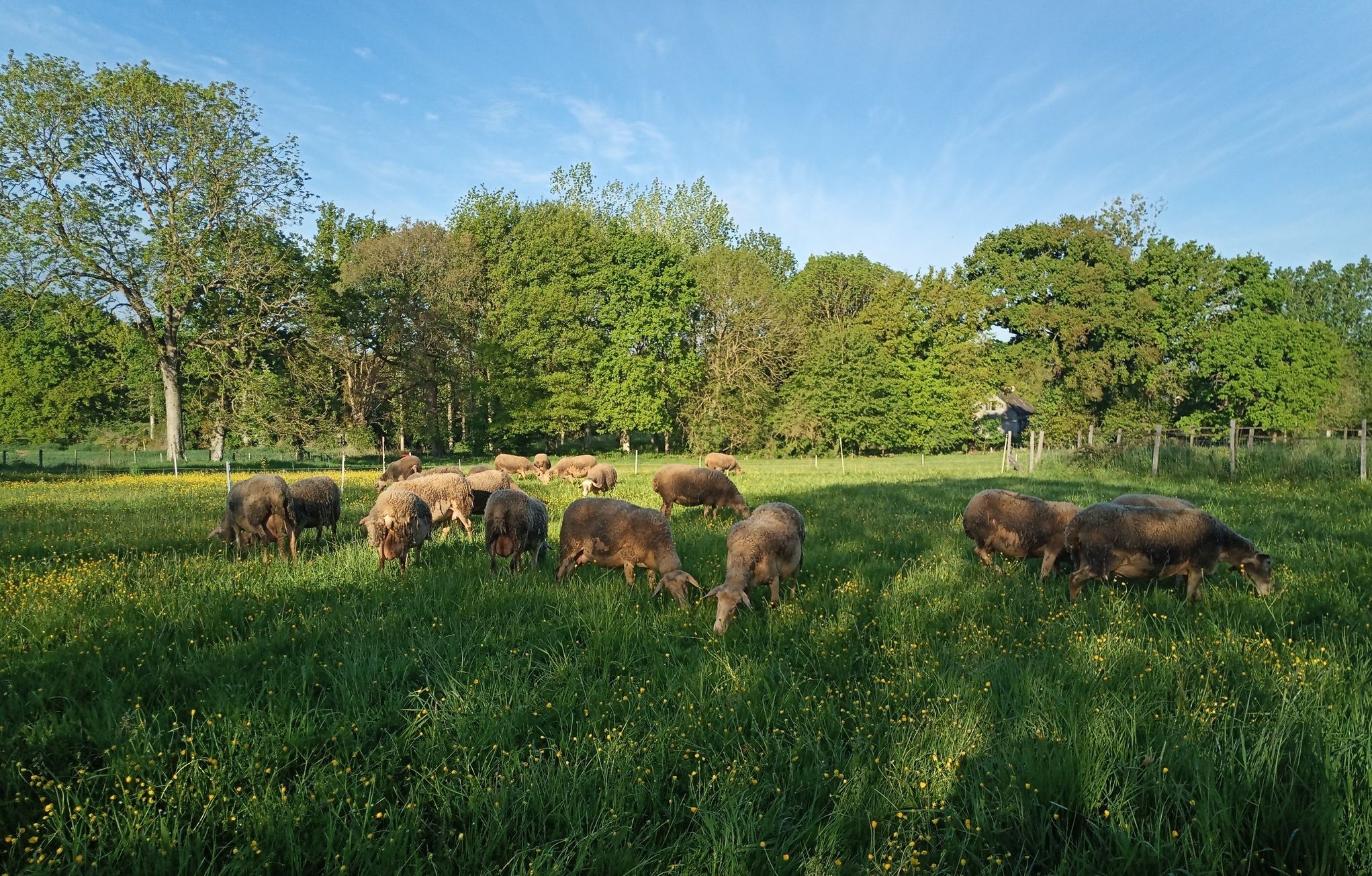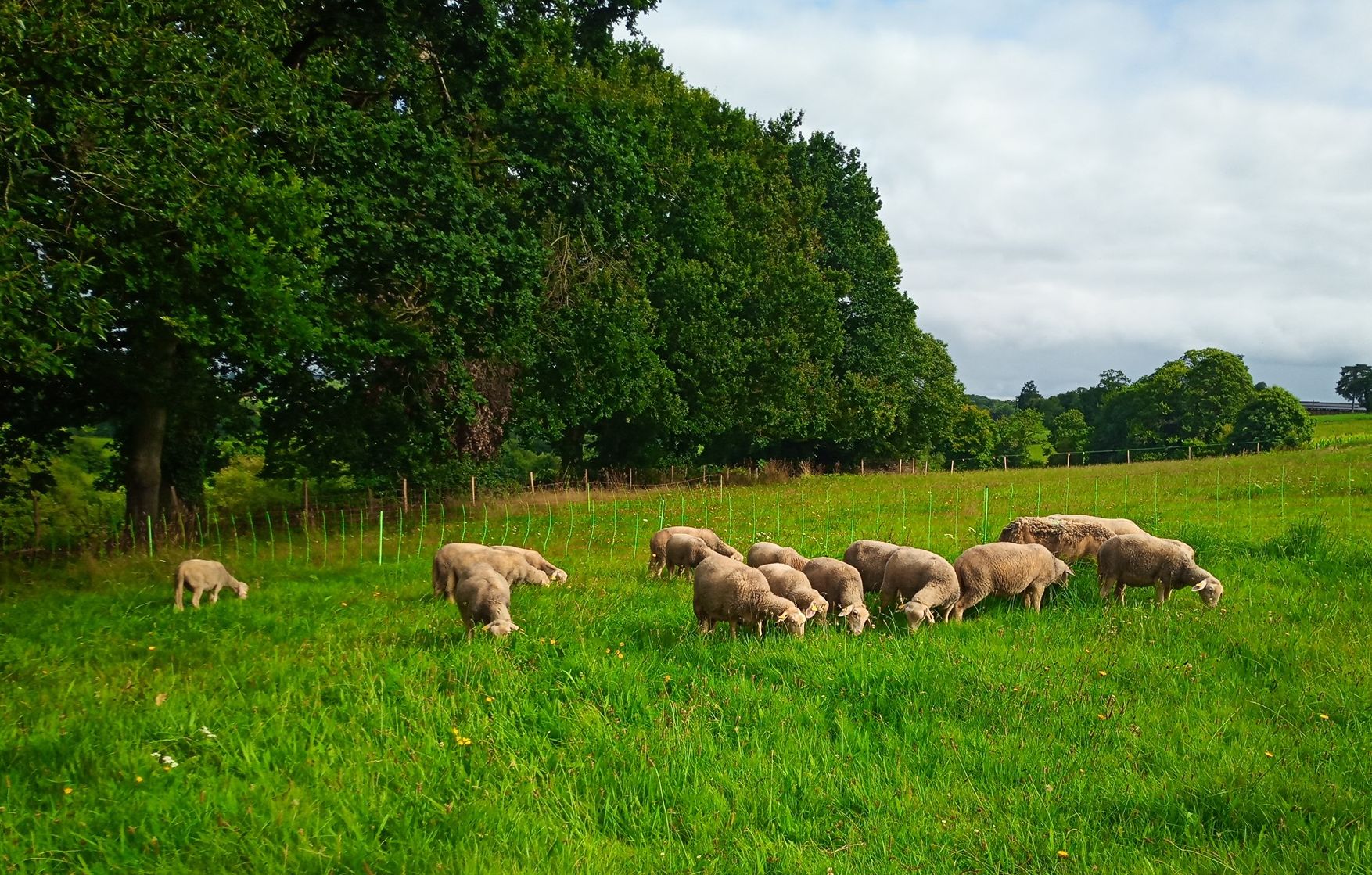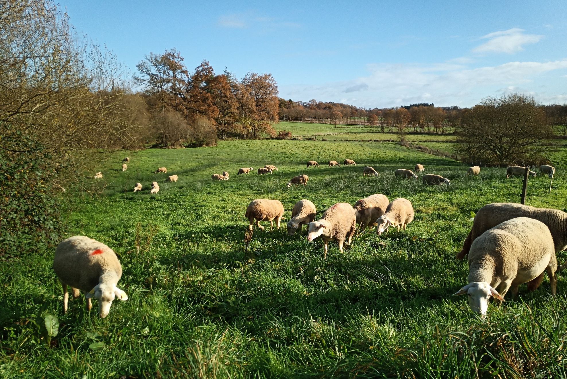Les brebis sont nourries essentiellement à l’herbe sur des prairies permanentes naturelles, bordées de haies et d’arbres, et au foin.